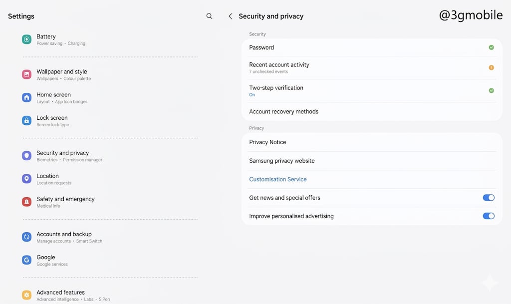→ Truy cập: Cài đặt → Tài khoản Samsung → Quyền riêng tư & bảo mật → Tắt Customization Service