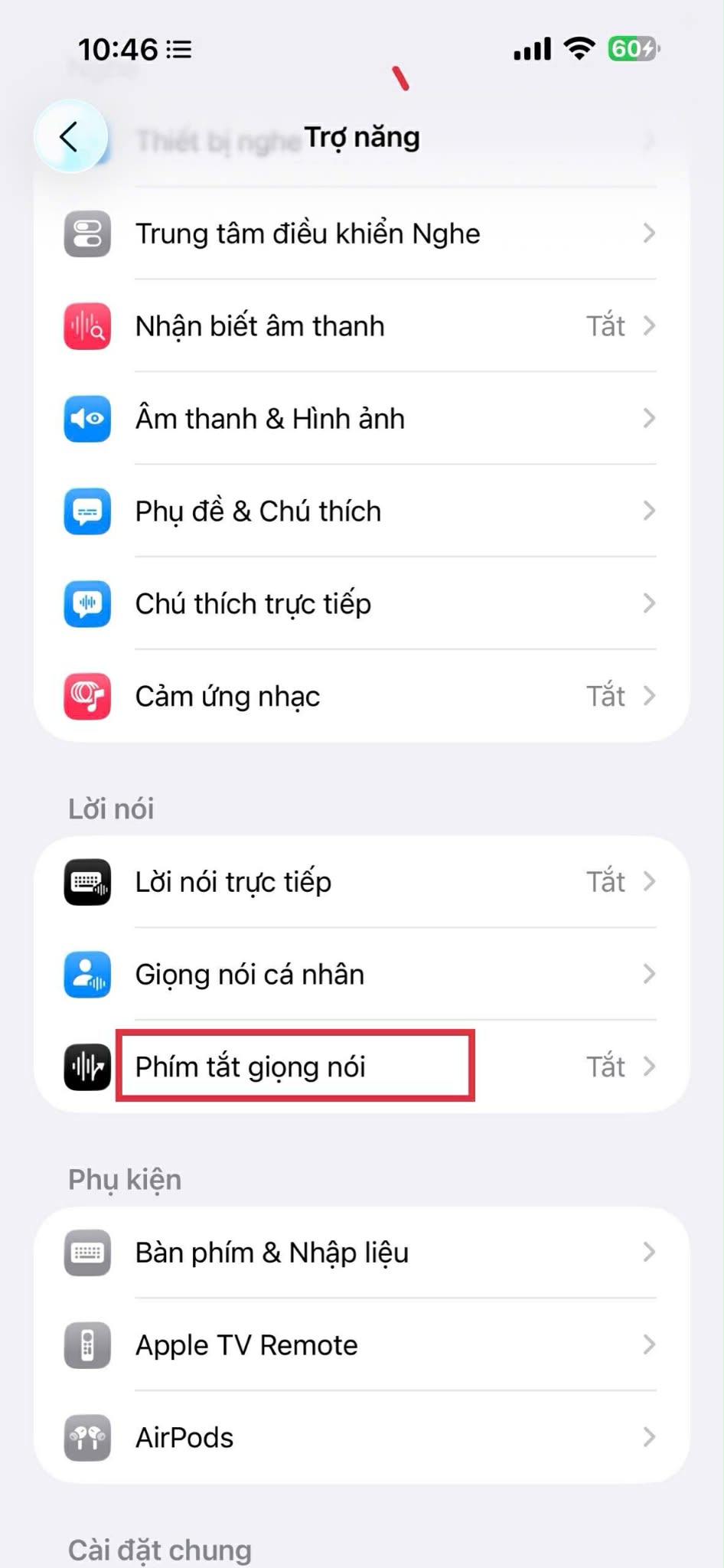 Tìm và chọn Phím tắt giọng nói.