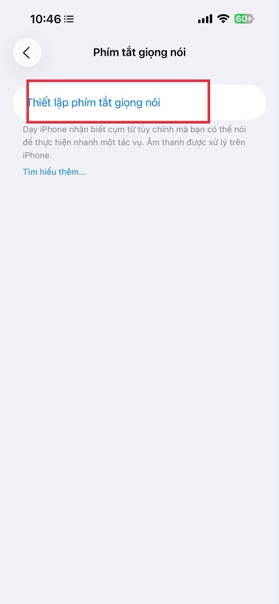 Nhấn Thiết lập phím tắt giọng nói → chọn Tiếp tục.