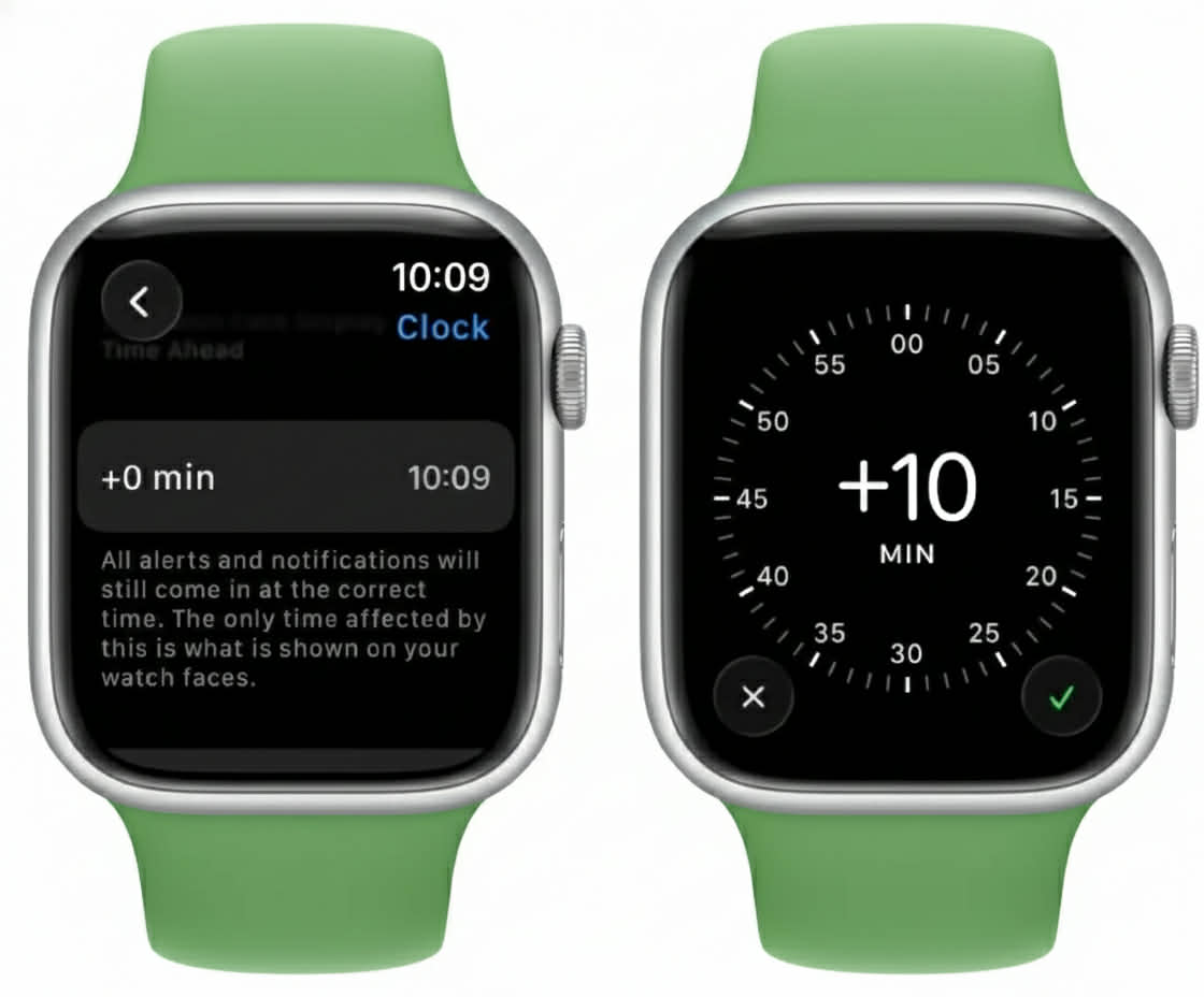 Lưu ý: Chỉ nên đặt nhanh hơn từ 3–5 phút, tối đa không quá 10 phút. Nếu chênh lệch quá lớn, việc đối chiếu thời gian giữa Apple Watch và iPhone có thể gây nhầm lẫn trong quá trình sử dụng hằng ngày.