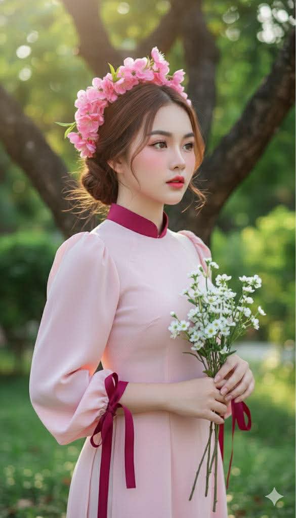 • Chủ thể: Một phụ nữ trẻ Châu Á, tóc nâu được búi thấp nhẹ nhàng, có cài một cụm hoa lớn màu hồng (có thể là hoa đào). Cô ấy có làn da trắng sứ, trang điểm sắc sảo (mắt to, mi cong, má hồng đậm, môi đỏ/hồng tươi). • Trang phục: Áo dài cách tân màu hồng. Điểm nhấn là tay áo rộng, phồng, có chi tiết dây nơ màu hồng đậm thắt ở cổ tay, tay áo cổ áo cũng màu hồng đậm.